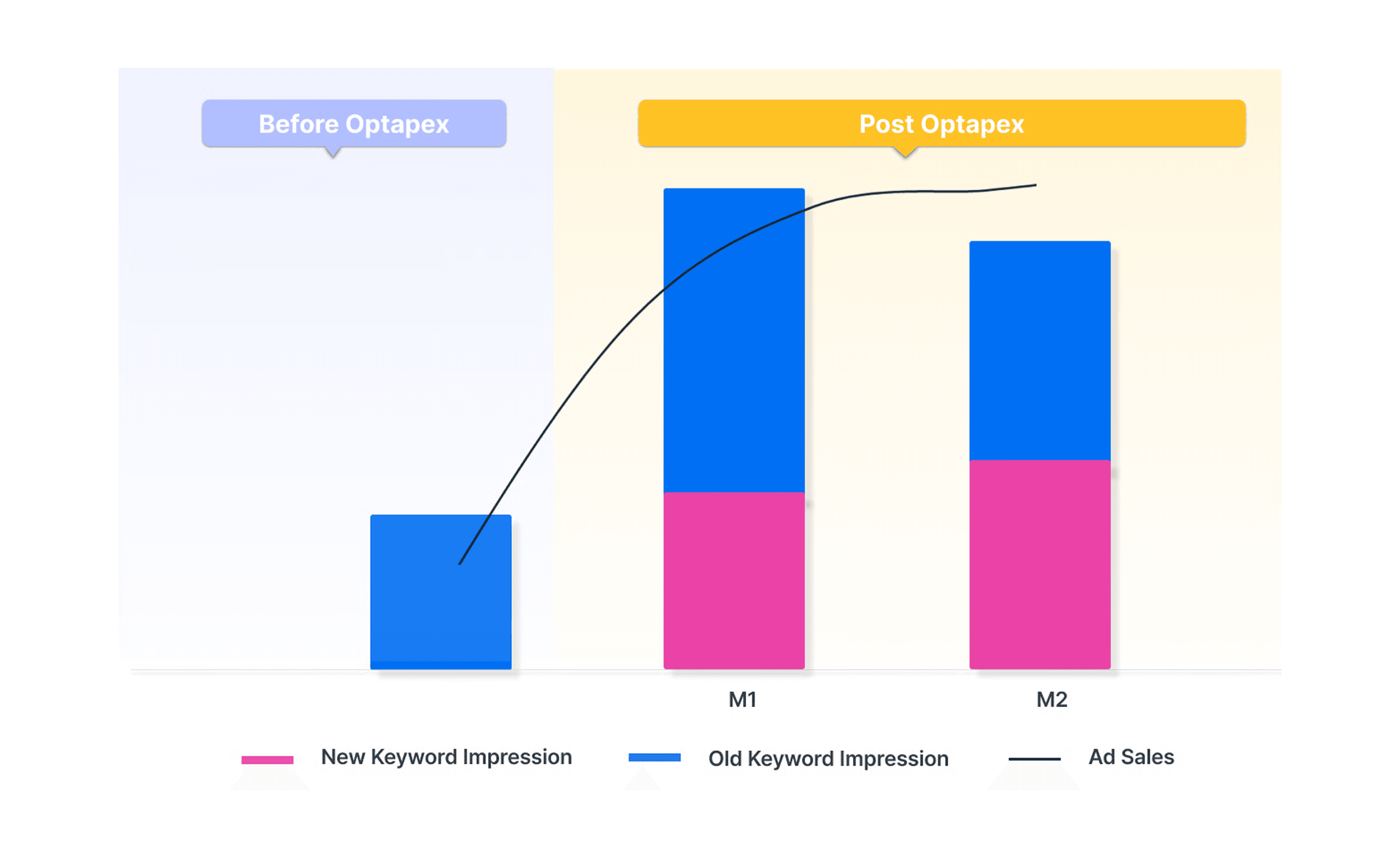 In the case of LG H&H, LG Optapex was able to pick out 198 new keywords. 95 keywords from the new 198 keywords did not have any ad conversion in past 30 days. However, these keywords were able to generate significant ad sales over the period of two months, and was able to increase the total ad sales by 40.5%. At the same time, the new keywords were able secure an additional 38.5% additional impression.